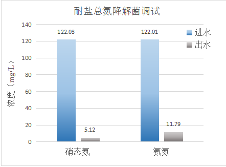 糧果廢水鹽度2%,30℃下經過我司耐鹽總氮降解菌的生物調試后,硝態氮的去除率超過95%、氨氮的去除率超過90%。